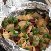 Tear 4 large sheets of aluminum foil, about 16 inches long each. Divide the potato mixture amongst the 4 sheets of aluminum foil and fold the sides up on both ends so you create a securely wrapped parcel for the potatoes.