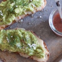 Divide the mashed avocado on top of the 2 pieces of cheesy toast.