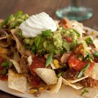 Lay the chips on a baking sheet and pile them high with cheese, chicken, refried beans and corn. Transfer the baking dish into the oven and bake for a few minutes until the cheese is melted.