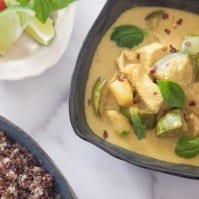 After the chicken and potatoes are fully cooked, add the soy sauce and remove from the heat. Taste and season with salt if needed and the juice of 1 lime. Toss in a few fresh basil leaves and stir to combine. Let the flavors develop for another 5 minutes before serving over rice or quinoa.