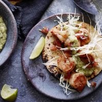To assemble, toast the tortillas over an open flame. Place a few pieces of shrimp into the center of each tortilla along with some shredded cabbage. Add a few tablespoons of pico de gallo and drizzle with 1 to 2 tablespoons of the tomatillo avocado salsa and garnish with cilantro. Serve.