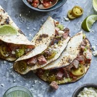 To serve, slice against the grain. Serve with pico, guacamole, and charred tortillas.