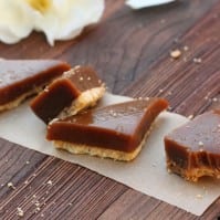 Meanwhile, in a pot combine the topping ingredients; butter, brown sugar, corn syrup, salt, sugar and cream. Bring to a boil and make sure all the sugar is dissolved. Stir for about 5-10 minutes until its thick and bubbly. If you have a candy thermometer - the caramel should be about 248 degrees. Remove from heat, stir in vanilla extract and pour on top of the shortbread.