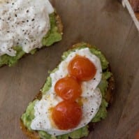 Divide the mashed avocado on top of the 2 pieces of toast, followed by 1/4 cup of the burrata on top of each.