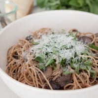 Add the pasta to the boiling water and cook according to the package directions. Once the pasta is cooked, reserve 1/2 cup of the pasta water and drain the pasta. Add the cooked pasta and remaining water to the mushroom mixture and toss to combine. Adjust salt and pepper as needed and top with basil and parmesan cheese. Toss everything together to combine and serve.
