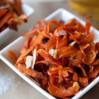 Peel the skin off the sweet potato and discard. Continue to peel the sweet potato so you have lots of thin strips of the sweet potato fresh. Put these strips onto the parchment lined baking sheet. Drizzle with the olive oil and top with the Parmesan, garlic salt, paprika, salt and pepper. Using your fingers, mix the toppings into the strips of sweet potato until evenly coated.
