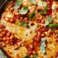 Simmer for 10 minutes. Add the shredded cheese on top and transfer to the broiler to melt the cheese until bubbly and golden. Season with salt and pepper and basil and serve with chunky bread on the side. Also excellent served over roasted chicken!