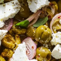 Break the feta into the olive mixture. Remove the roasted charred oregano stems, Sprinkle with the remaining leaves from 2 new sprigs of oregano over the top and the lemon zest and serve warm alongside the bread