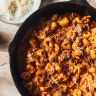 Cook the tortellini according to the package directions. Save ¼ cup of the pasta water and add it to the sauce along with the drained pasta. Season with salt & pepper as needed and serve with fresh parmesan sprinkled over top.