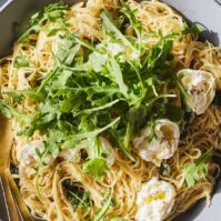 To serve, transfer to a dish and drizzle with a bit of olive oil. Top with torn pieces of Burrata cheese and some arugula.