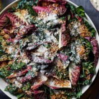 Pour the dressing over the kale and Treviso and toss well to thoroughly combine. Taste and adjust seasoning to taste. Let the salad sit for about 5 minutes until the kale starts to soften. Top with the toasted breadcrumbs tossed with butter and more shredded pecorino cheese.