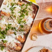 Add the beans, garlic, chipotles and salt to a blender and puree until smooth. Add stock (or water) until the puree has the consistency of a thick soup. Taste and adjust salt as needed. If you want it spicier, add a few teaspoons of the liquid from the chipotles in adobo. Transfer most of the mixture to a large shallow bowl and line a baking dish with about 1/3 cup of the mixture to create a base layer.